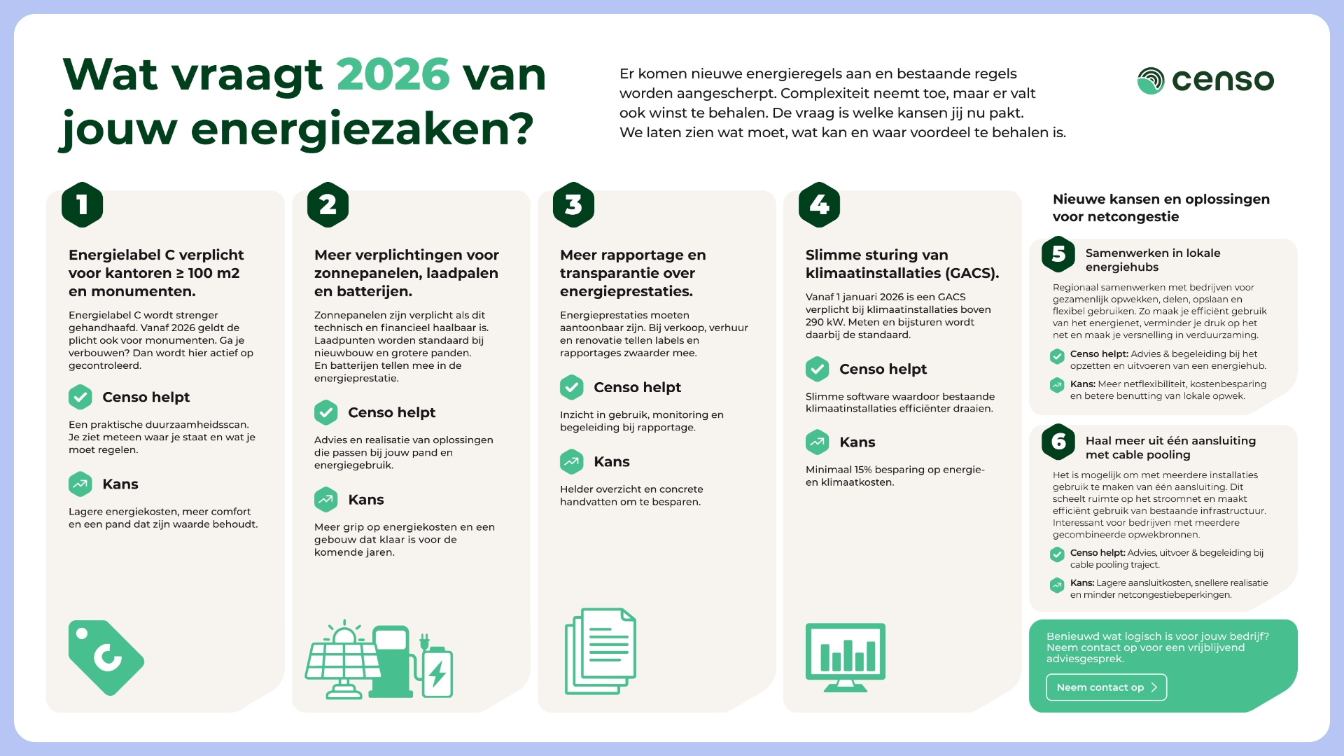 Nieuwe wetgeving, aangescherpte verplichtingen en een voller elektriciteitsnet maken energieprestaties belangrijker dan ooit. Tegelijkertijd ontstaan er kansen om kosten te besparen, toekomstbestendig te investeren en grip te krijgen op energie. Zo zetten we samen de beste stappen in de energietransitie.